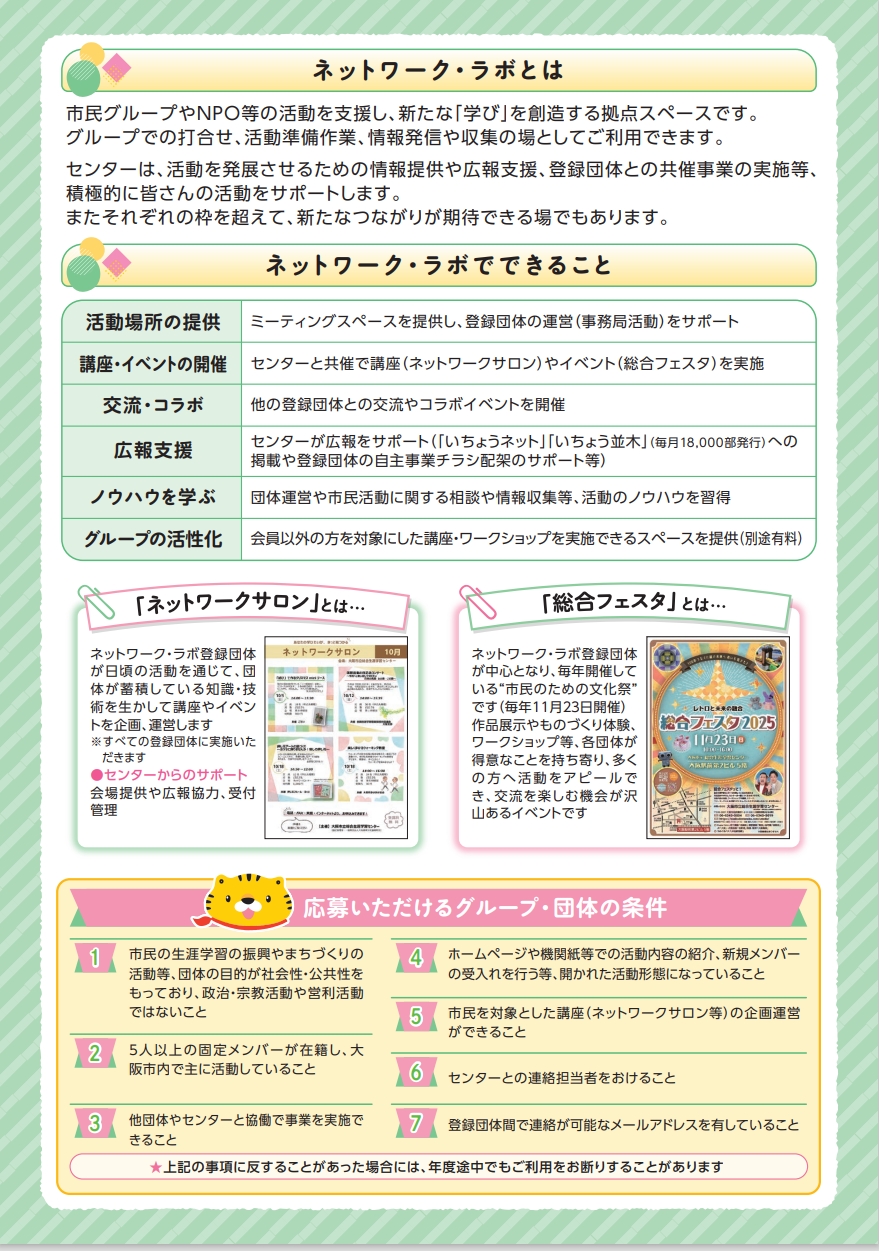 大阪市内を中心に、生涯学習活動を進めている市民グループ、NPO団体やこれから活動を始めようとするグループの活動を支援する拠点スペースである「ネットワーク・ラボ」の登録団体を募集しています。グループでの打合せ、準備作業、情報の発信や収集の場としてご利用できます。また、自分たちの活動を協働することにより、多くの人にPRしたいと考えている団体へ朗報です!! みなさまの活動を総合生涯学習センターでは、応援します!