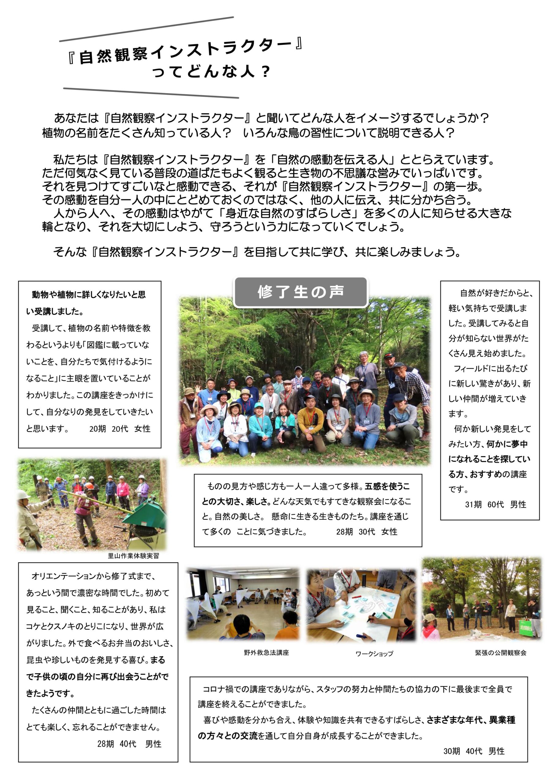 私たちは「自然観察インストラクター」を「自然の感動を伝える人」ととらえています。修了生は当協会の観察会グループで活動している人が多数!