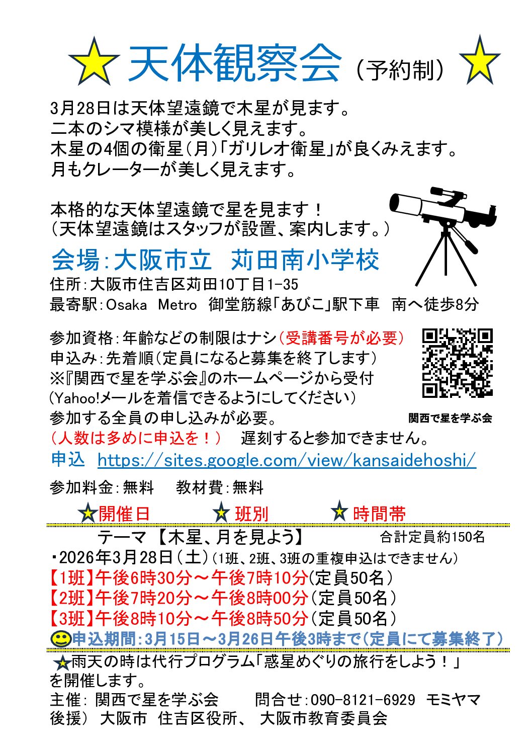 天体観察会では受講者以外に、スタッフ(ボランティア)も「関西で星を学ぶ会」のホームページにて募集中です。