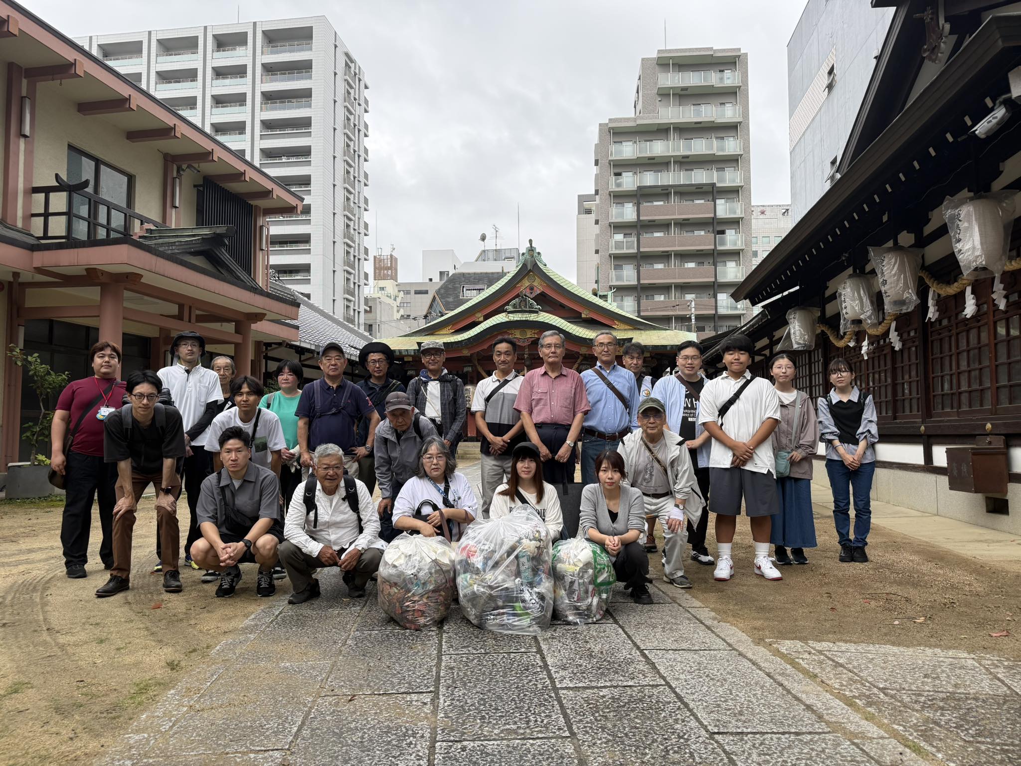 毎月1回集まって、大阪市北区国道沿い、天神橋筋道路、堀川戎神社境内・阪神高速道路高架下の清掃をしています。。