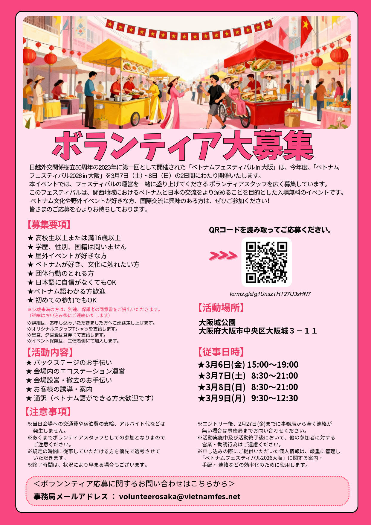 E-mail)volunteerosaka@vietnamfes.net、kawashita@ex-ad.co.jp