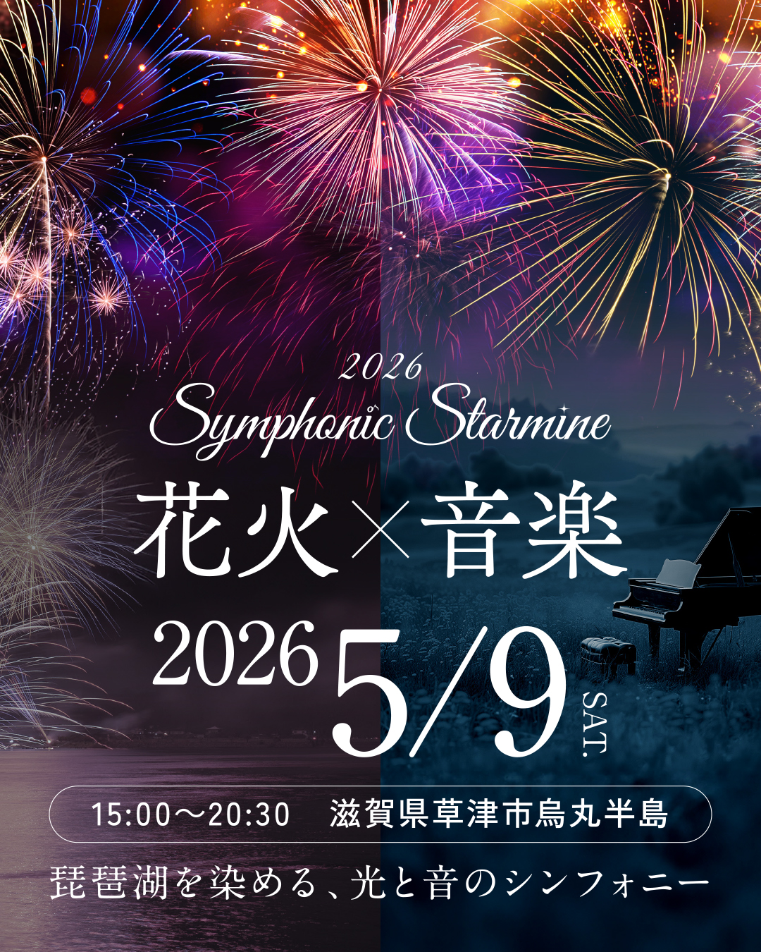 「Symphonic Starmine 2026」は、草津・烏丸半島で花火と音楽、生演奏と 1000 人合唱、 公開ダンサー、観客が一体となる共創型ライブアートフェス。 比叡山に沈む夕景から夜空のスターマインへと続く唯一無二の体験を通し、 地域に“繋がり”を育む一日限りの祭典です。 |